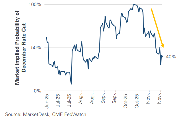 Implication: Markets had fully priced in a December cut a month ago. The sharp drop in expectations has become a drag on sentiment.