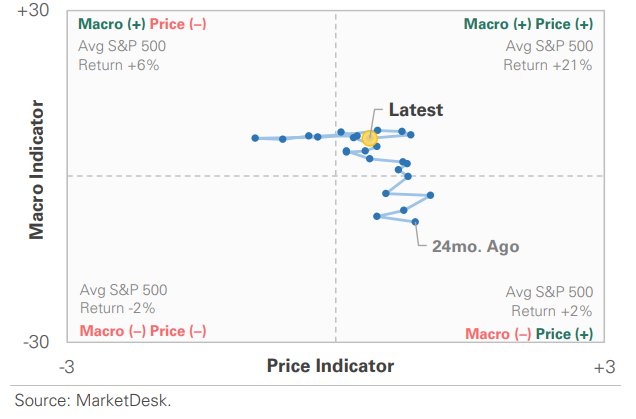 The Market Cycle Indicator tracks two primary investor groups: macro investors and price-based investors. Macro investors rely on fundamental and economic data to guide their decisions, while price-based investors (or technical analysts) focus on price action, momentum, volume, and behavioral trends. The Indicator synthesizes these perspectives to identify the prevailing market regime.