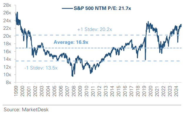 The S&P 500 forward price-to-earnings (P/E) ratio is a widely followed valuation metric that compares the index's current level to the projected earnings of its constituent companies over the next 12 months. The indicator implies to investors how much they are paying today for each dollar of expected future earnings.