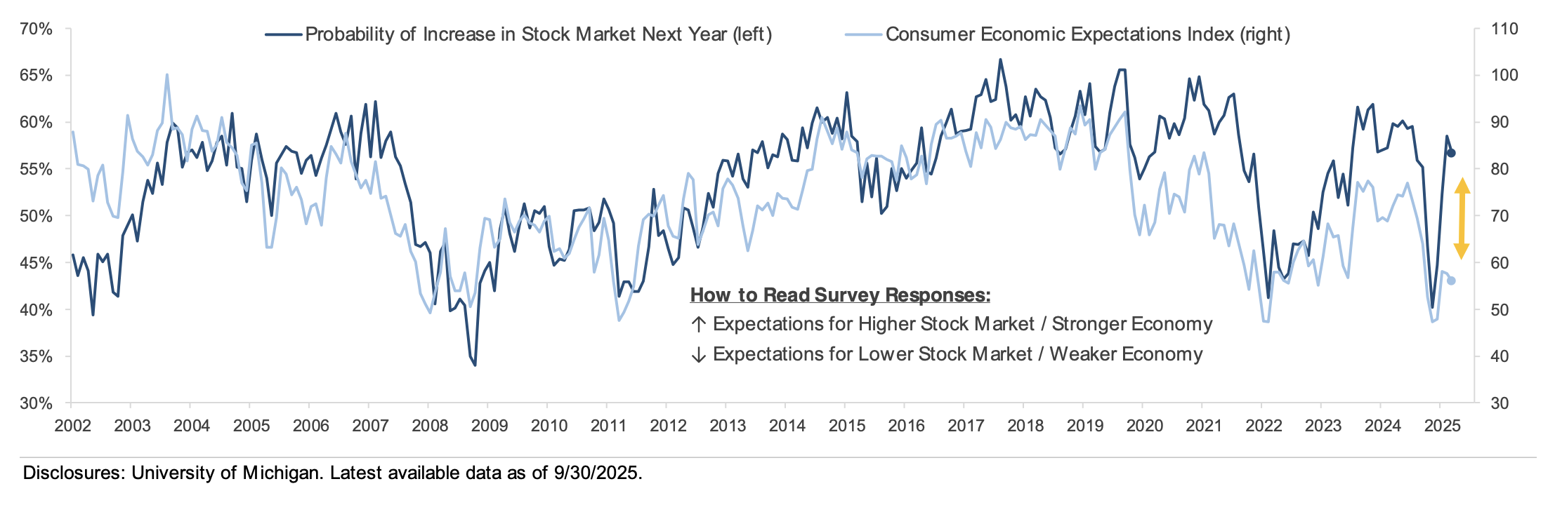Historically, these two series move together: when consumers feel better about the economy, they feel better about the stock market. However, that relationship has broken down this year. Nearly 60% of consumers expect the stock market to rise, while the expectations index sits near levels from the pandemic and the 2008 financial crisis. The takeaway: confidence in the stock market has rebounded, but overall sentiment remains weak.