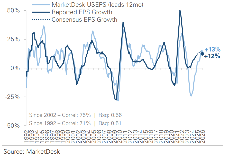 Implication: Recently announced tariffs have already weighed on confidence and soft survey data. The risk is that hard data slows next, leading to slower EPS growth and negative revisions.