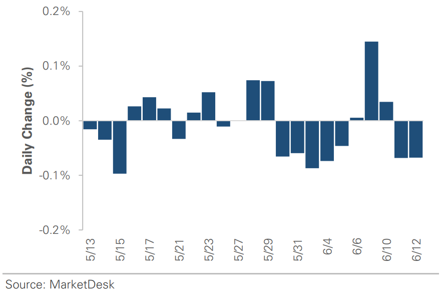 The past two weeks were filled with significant macro events and the first round of May data releases, including ISM Mfg and PMIs, nonfarm payrolls, CPI and PPI data, and the June FOMC meeting. The chart below shows that Treasury yields have been highly volatile as investors react to each data point. It started with concerns about economic growth last week, which shifted to a strong labor market and easing inflation this week. In the upcoming week, retail sales, industrial production, and housing data will provide further insights into the state of the economy. However, we expect a strong market reaction if there is a significant beat or miss. Looking ahead to the end of June, implied volatility is decreasing as the calendar becomes less crowded, which should relieve a market whipsawed by news headlines.