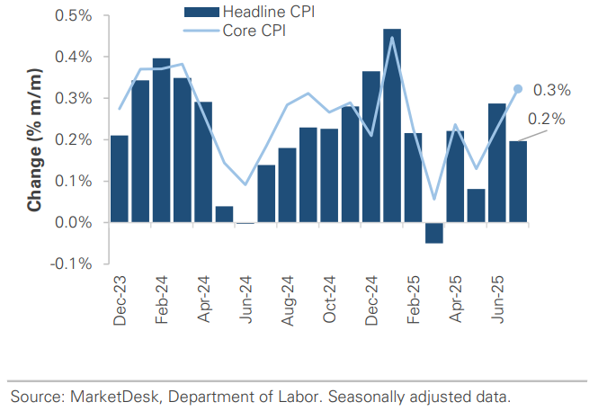 Headline Consumer Price Index (CPI) rose +0.2% in July, down from +0.3% last month, but the year-over-year rate held steady at +2.7%. Falling energy prices and flat food prices helped cool the headline number, but core inflation remained sticky. Core CPI rose +0.3%, the fastest pace since January, and up from +0.2% in June. The pickup was driven by a +0.4% rise in core services, an increase from last month’s +0.3%. Core goods rose +0.2%, in line with the prior month, with tariff-affected categories such as household furnishings and apparel showing modest gains after sharp increases last month.