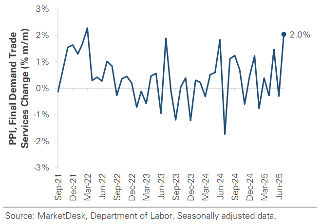 The hotter-than-expected PPI report and in-line CPI report offer clues about tariff passthrough. The trade services index in PPI, which measures wholesaling margins, accounted for most of the hot services PPI print. Wider trade margins signal rising cost pressures upstream and indicate distributors are raising prices to protect profit margins. The in-line CPI report, with a steady core goods reading, means companies are not fully passing through tariffs at this point, instead relying on promotions and non-tariffed inventories to remain competitive.