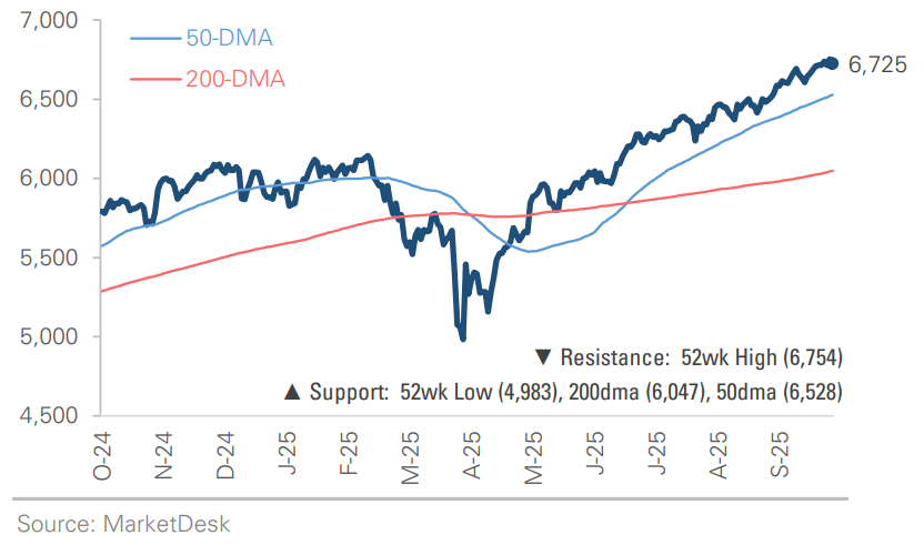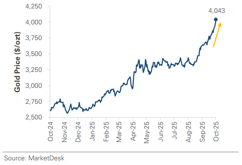 Stocks are not the only asset class setting new highs. Gold surged above $4,000 an ounce this week, bringing its year-to-date gain to more than +50%. The precious metal benefits from a combination of themes, including the government shutdown, expectations for more rate cuts, and economic uncertainty.