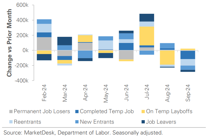 Unemployment fell by another -0.1% to 4.1%, and nonfarm payrolls rose by +254,000. This marks the second consecutive month of improving labor market conditions. Unemployment declined across age groups and genders, and initial jobless claims continued to retreat from their summer peak. Average monthly job gains remain strong at +175,000, a solid figure by historical standards. The market spent most of the past 6 months worrying about the labor market, but this report should alleviate some of the concern. Nearly 65% of the rise in unemployment was due to reentrants and new entrants, with temporary job completions accounting for 22% and permanent job losses contributing only 19%. The data indicated the labor market's main issue was an increase in supply rather than weaker demand. This thesis is supported by the fact that the drop in unemployment was due to reentrants/new entrants finding jobs and fewer individuals being on temporary layoffs. While there are reasons to be cautious, data suggests that the risk of unemployment surging to 6% is diminishing. Our view is unchanged: the labor market is finding a new equilibrium rather than deteriorating. Jobless claims jumped to a 12-month high this week, but the rise is distorted by auto worker strikes and hurricanes Helene/Milton, making them noisy and unreliable near-term.