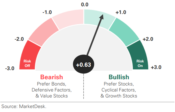 The US Risk Demand Indicator (USRDI) is a quantitative tool to measure real-time investor risk appetite. When the indicator is above zero, it signals a risk-on environment favoring cyclical sectors, high beta stocks, high-yield corporate bonds, and hybrid (convertible) bonds. In contrast, a reading below zero signals a risk-off environment favoring defensive sectors, low-volatility stocks, and US Treasury bonds.